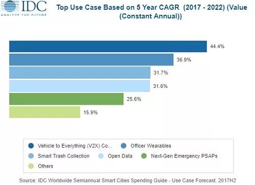 报告显示,固定视频监控、先进公共交通、智能交通管理和智能户外照明项目被认为是智慧城市项目支出增长最快的项目,2017年这些项目的技术支出为25.86亿美元,2018年将占亚太地区(不包括日本)智能城市项目的总技术支出的35%以上。然而,官方可穿戴设备(Fitbit/智能眼镜)和车联网(V2X)连接性将是支出增长最快的项目,其五年内(2017—2022年)的年复合增长率分别为36.9%和44.4%。